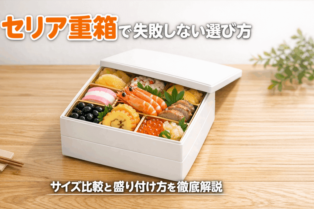 「セリアの100均重箱、サイズ感が分からず不安」「おせちを何品入れられる?」——そんな悩みを、写真計測と実測レビューで解消します。一般的な一段内寸約13~15cm角クラスなら、2~3人で副菜8~10品が目安。二段なら主菜を含めて最大16品まで無理なく収まります。用途別に段数・容量の選び方も整理しました。
